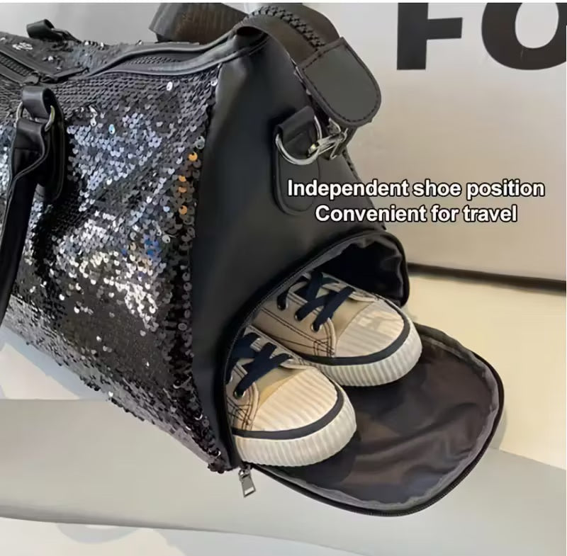 This Beautiful Sparkling Black Sequin Carry-on Overnight Luggage Bag is perfect for your travels. The shimmering silver sequins add a touch of elegance and style, while the spacious interior and multiple pockets ensure all your essentials are organized and easily accessible. The durable construction and compact size make it the ideal carry-on for your next trip.