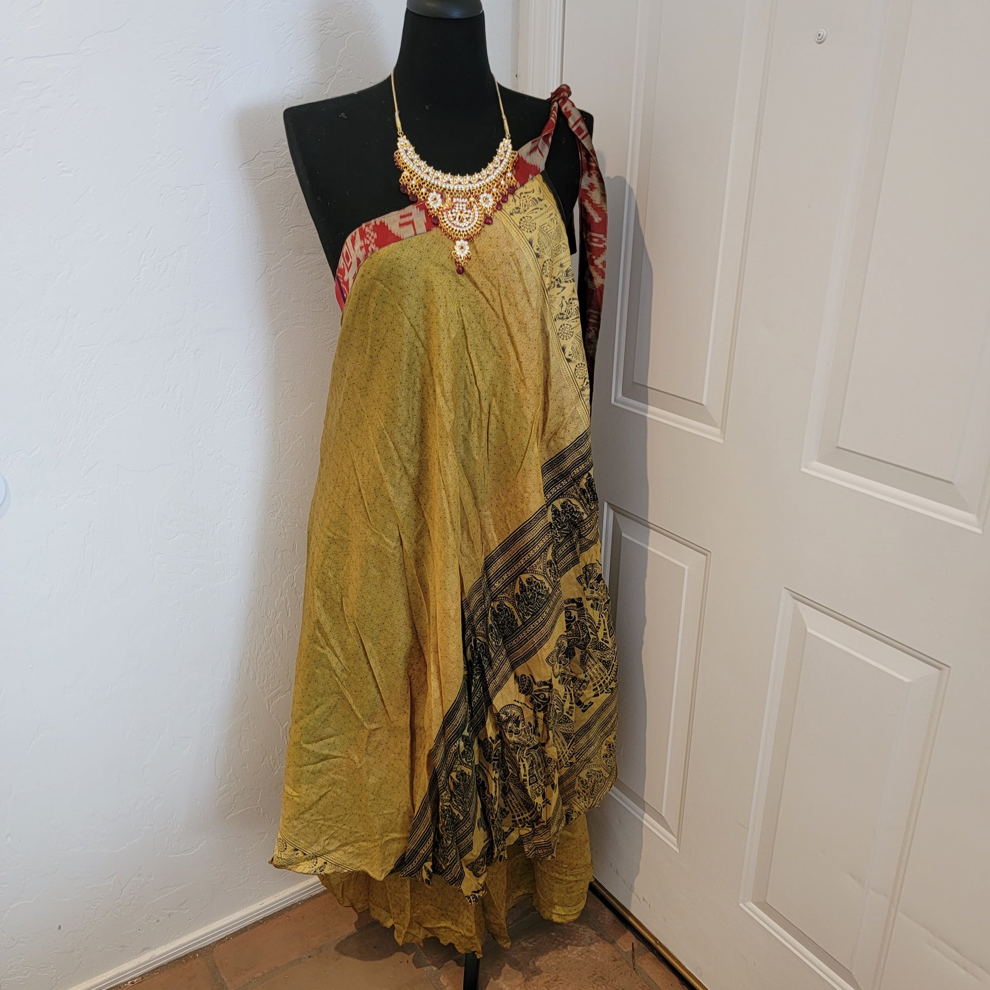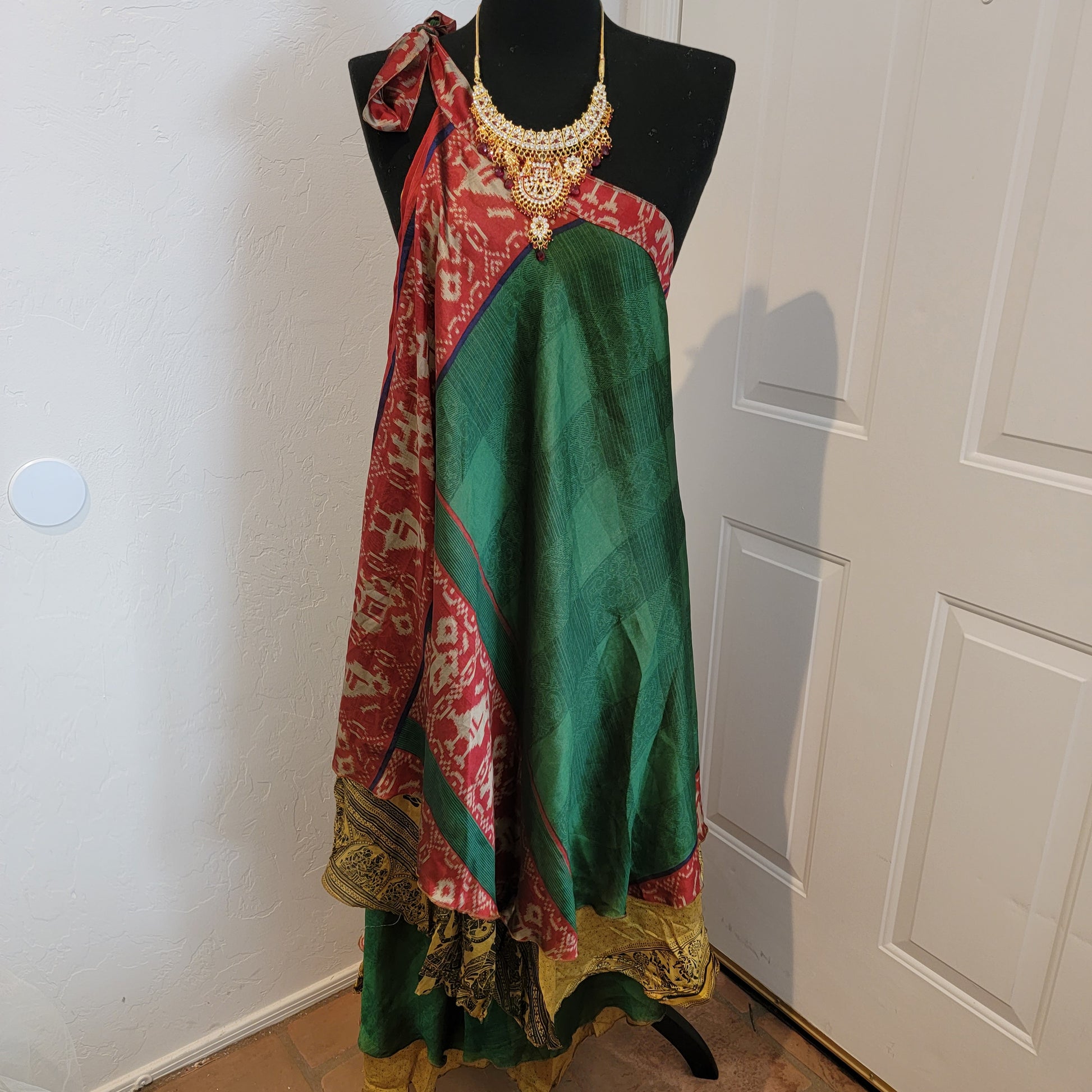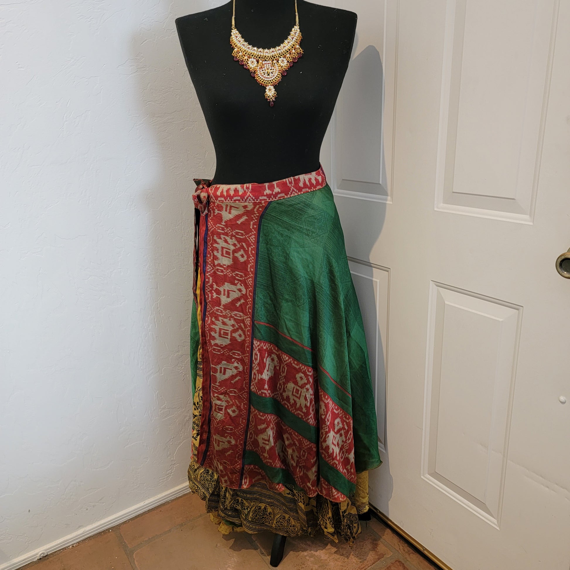 Boho Festival Green/ Gold Print Silk Reversible Wrap Maxi Skirt