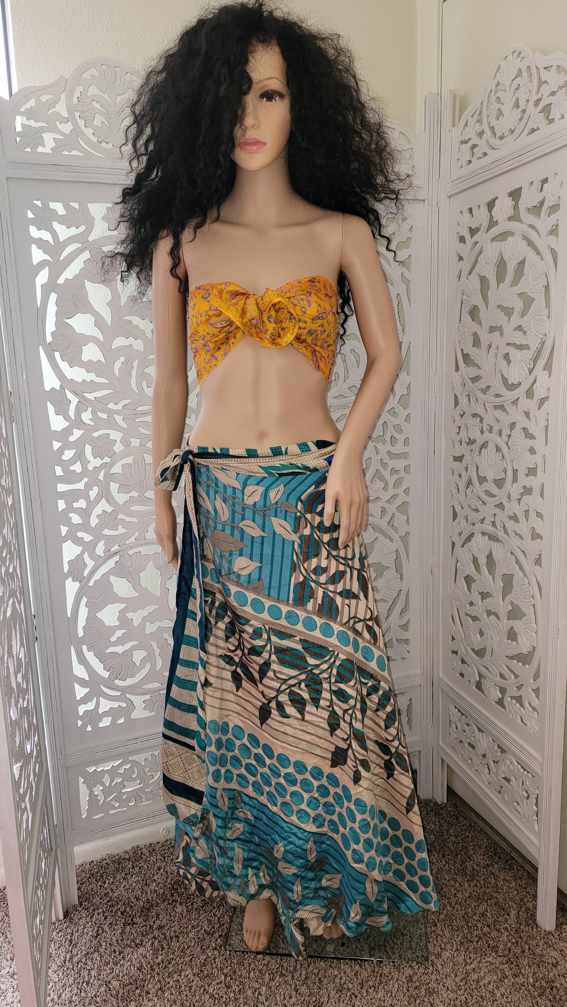 This romantic boho maxi skirt is 100% silk. It is reversible and can be worn many ways. The top is priced and sold separately. This item is a final sale. No returns, refunds, or exchanges allowed. Absolutely no exceptions will be made. This skirt is one size fits most.