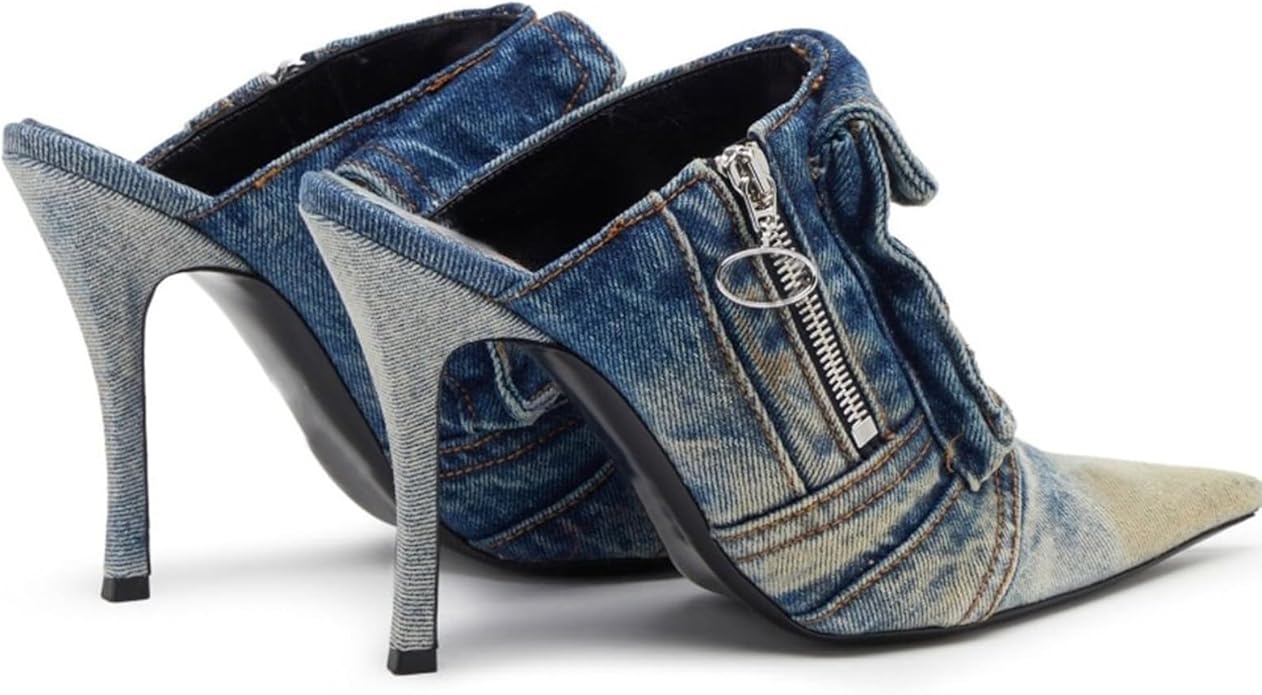 Chic Meduim Wash Distressed Denim Cargo Mule Heels