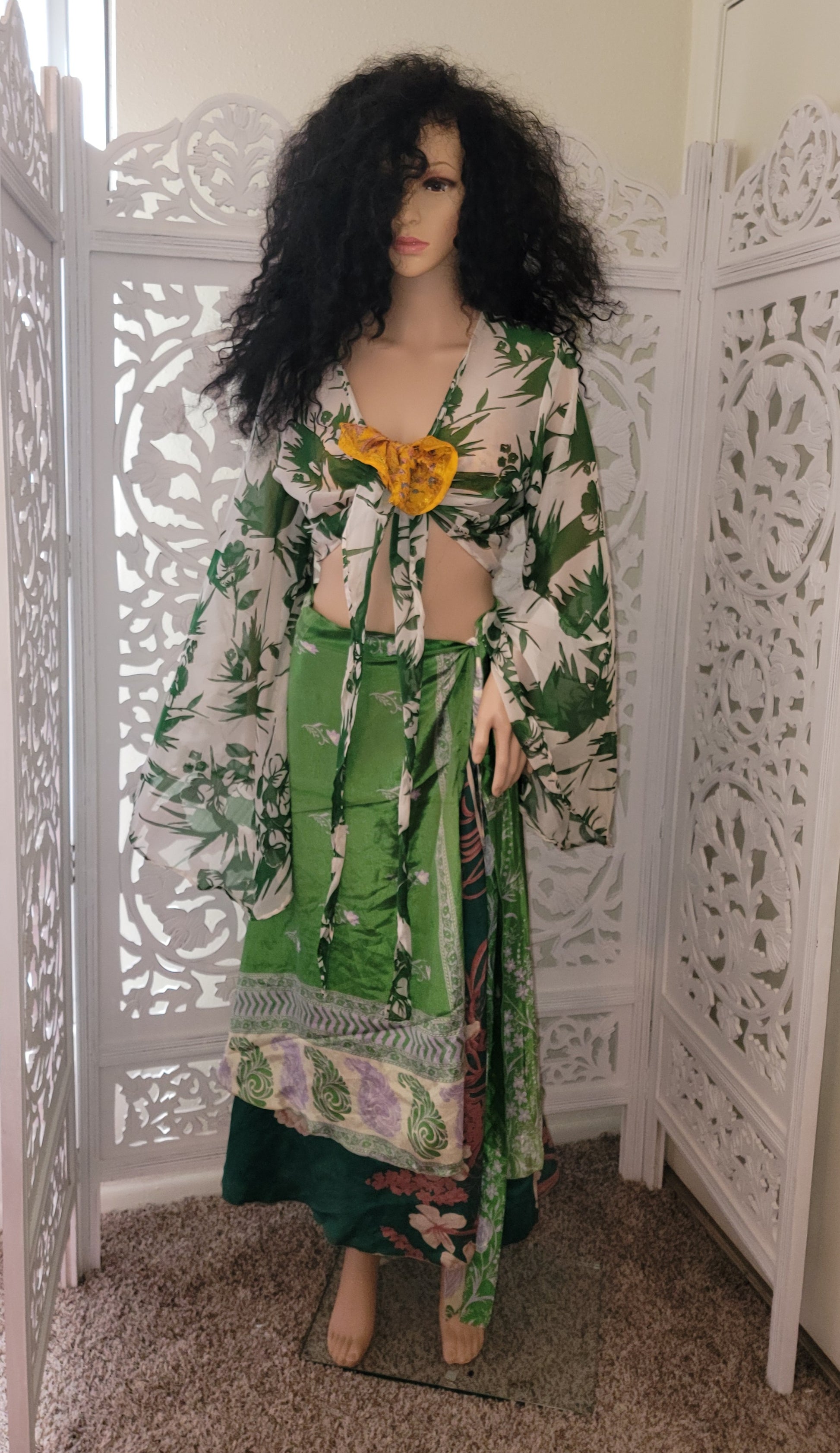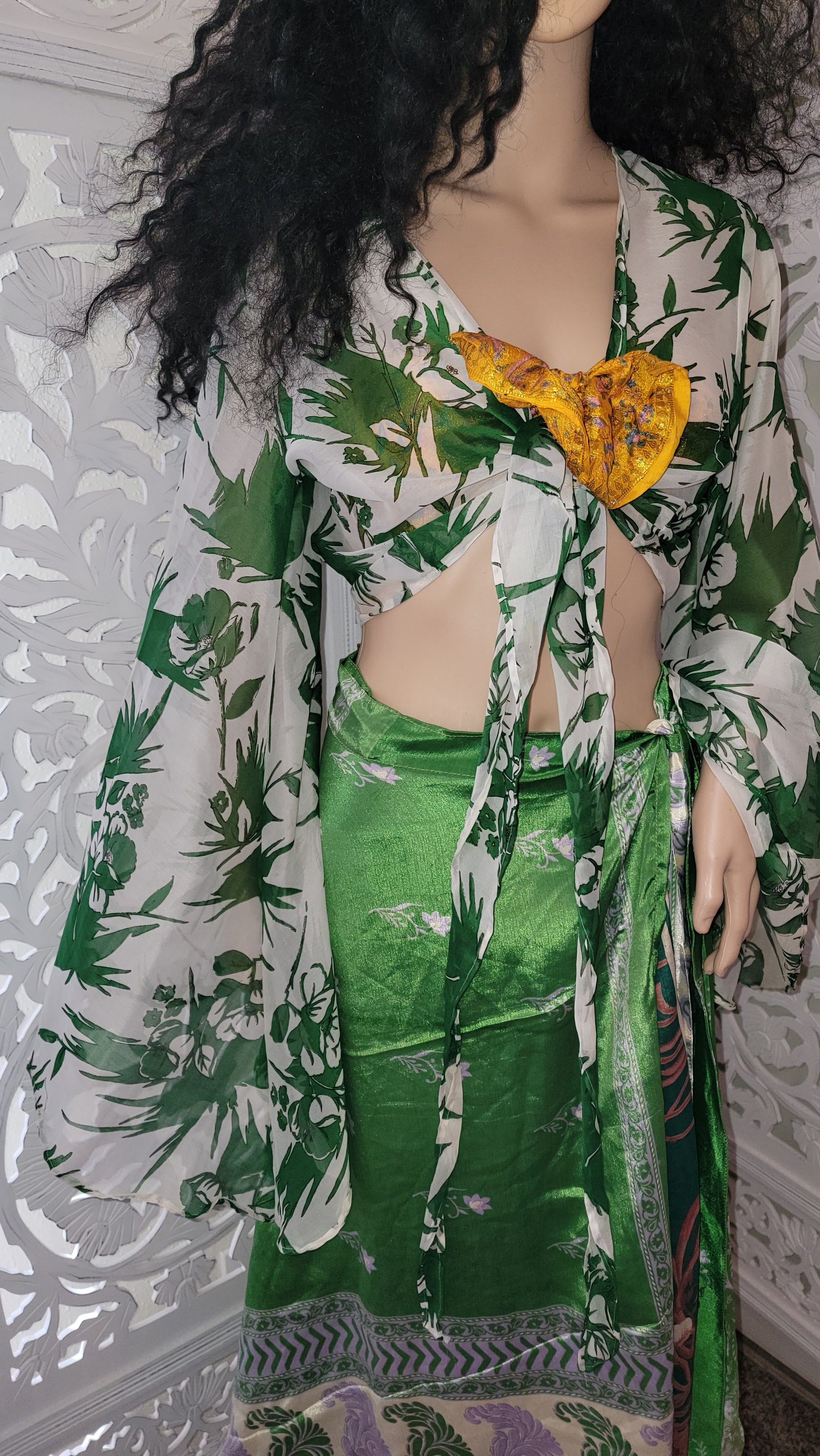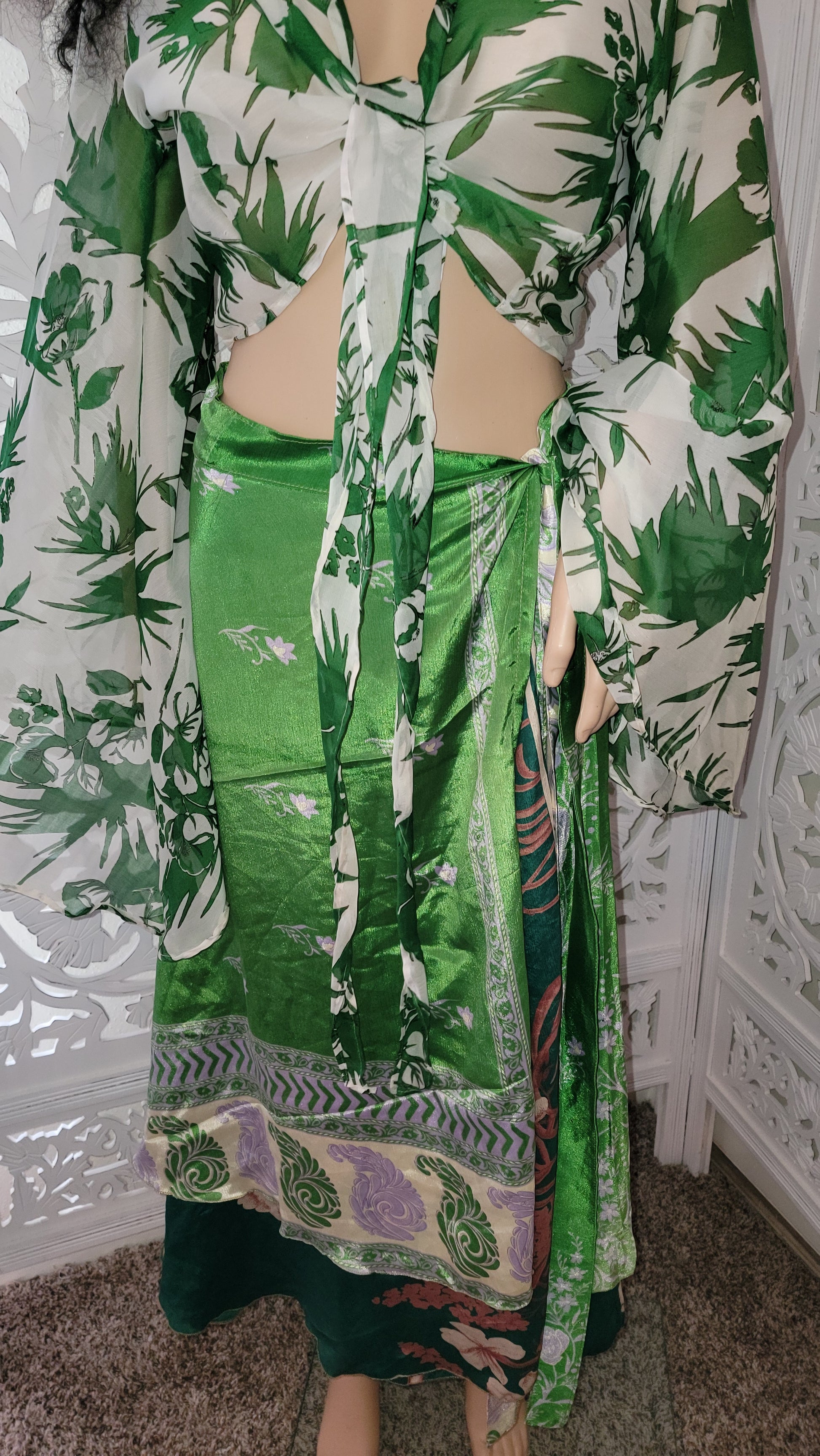 Silk Green Print Boho Reversible Wrap Maxi Skirt