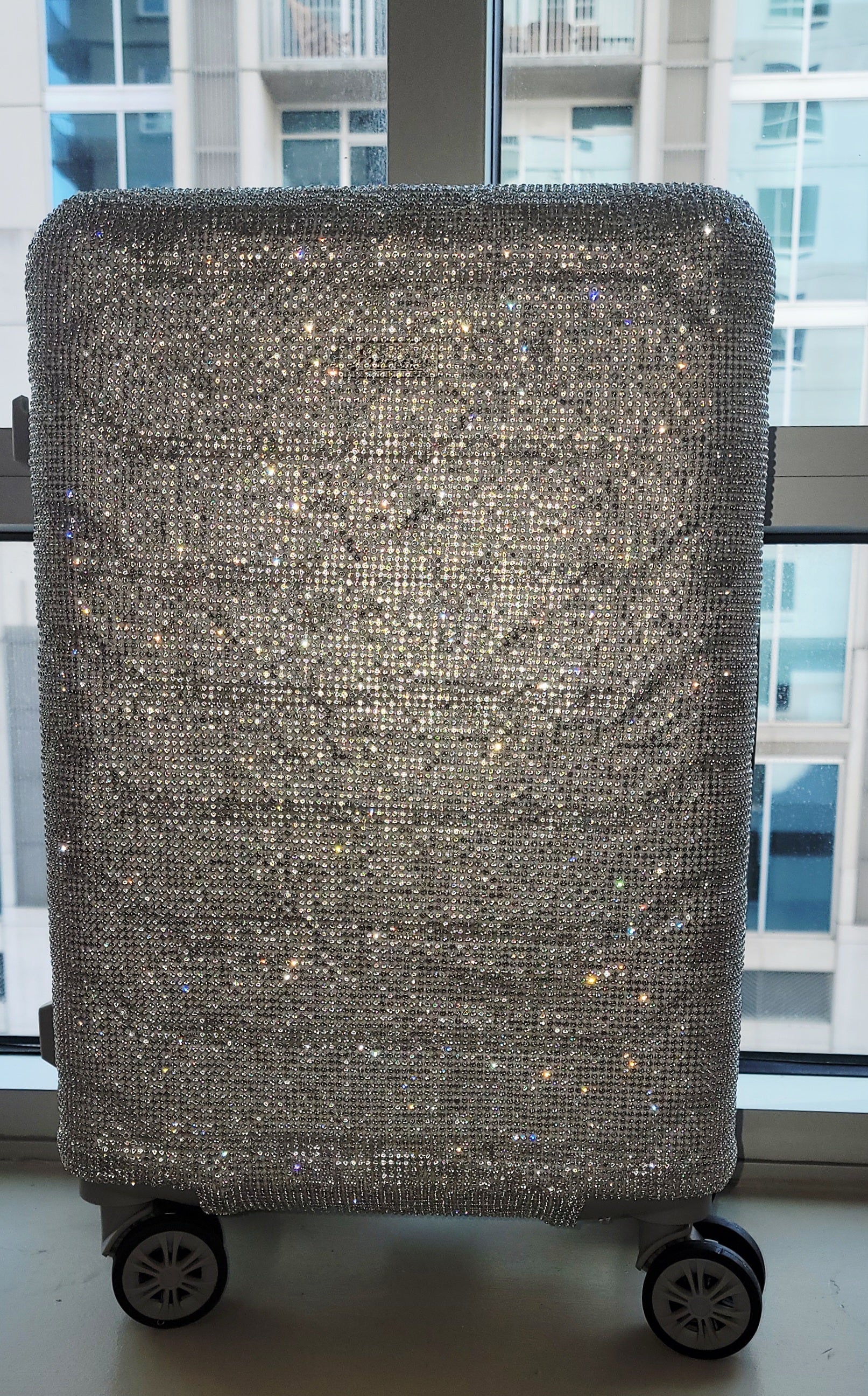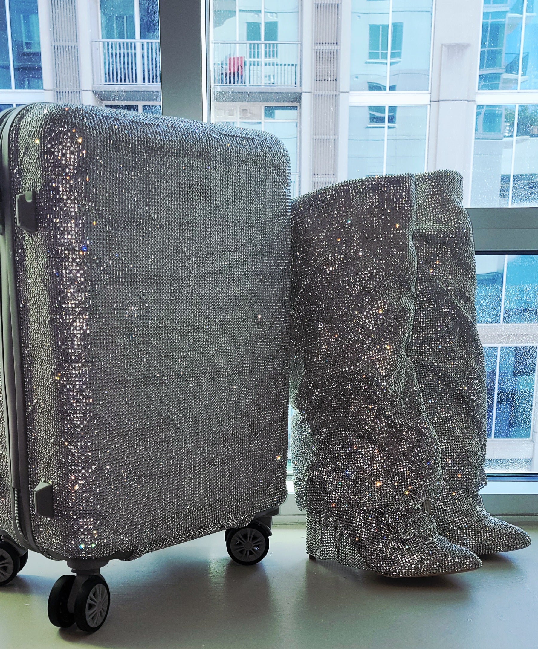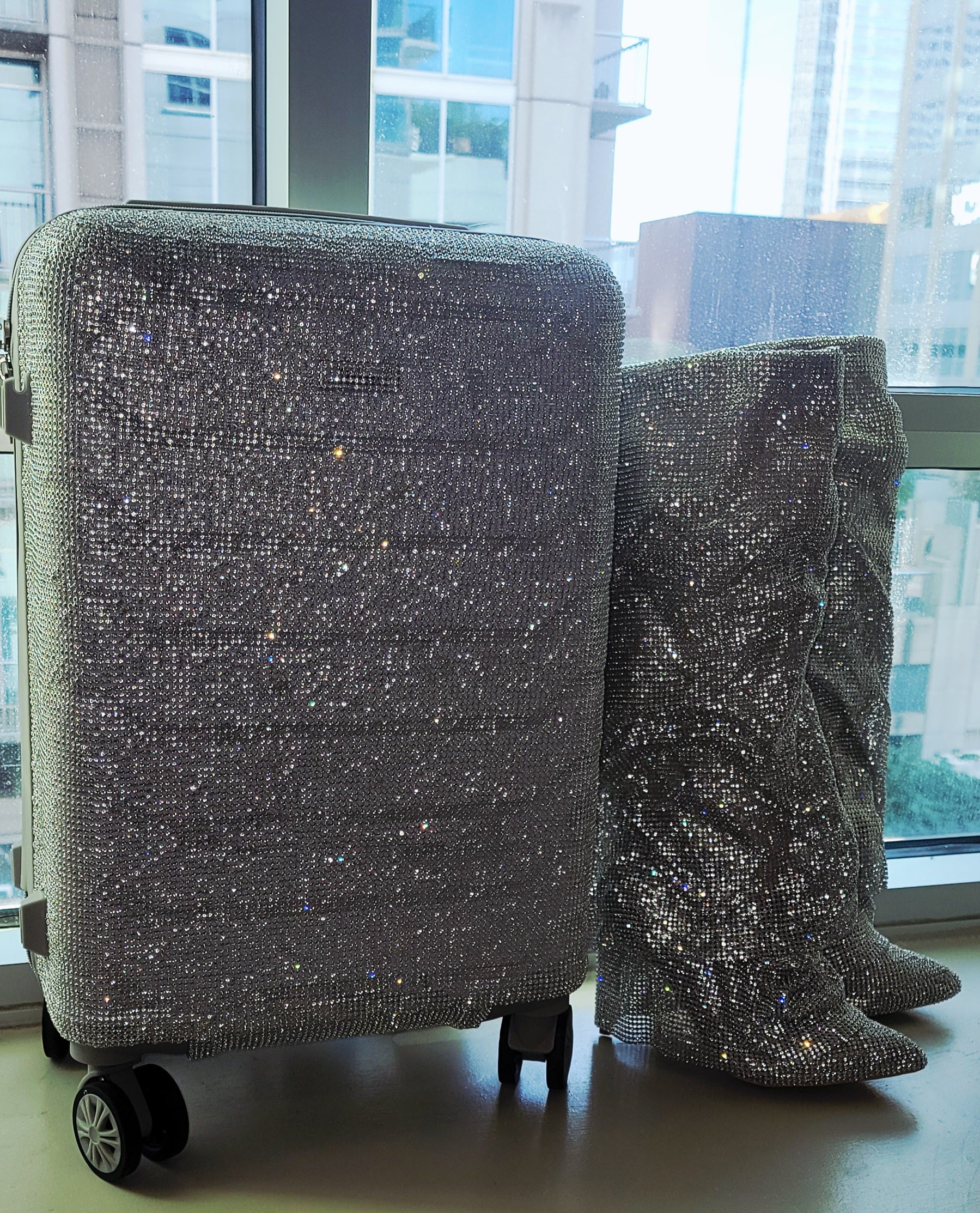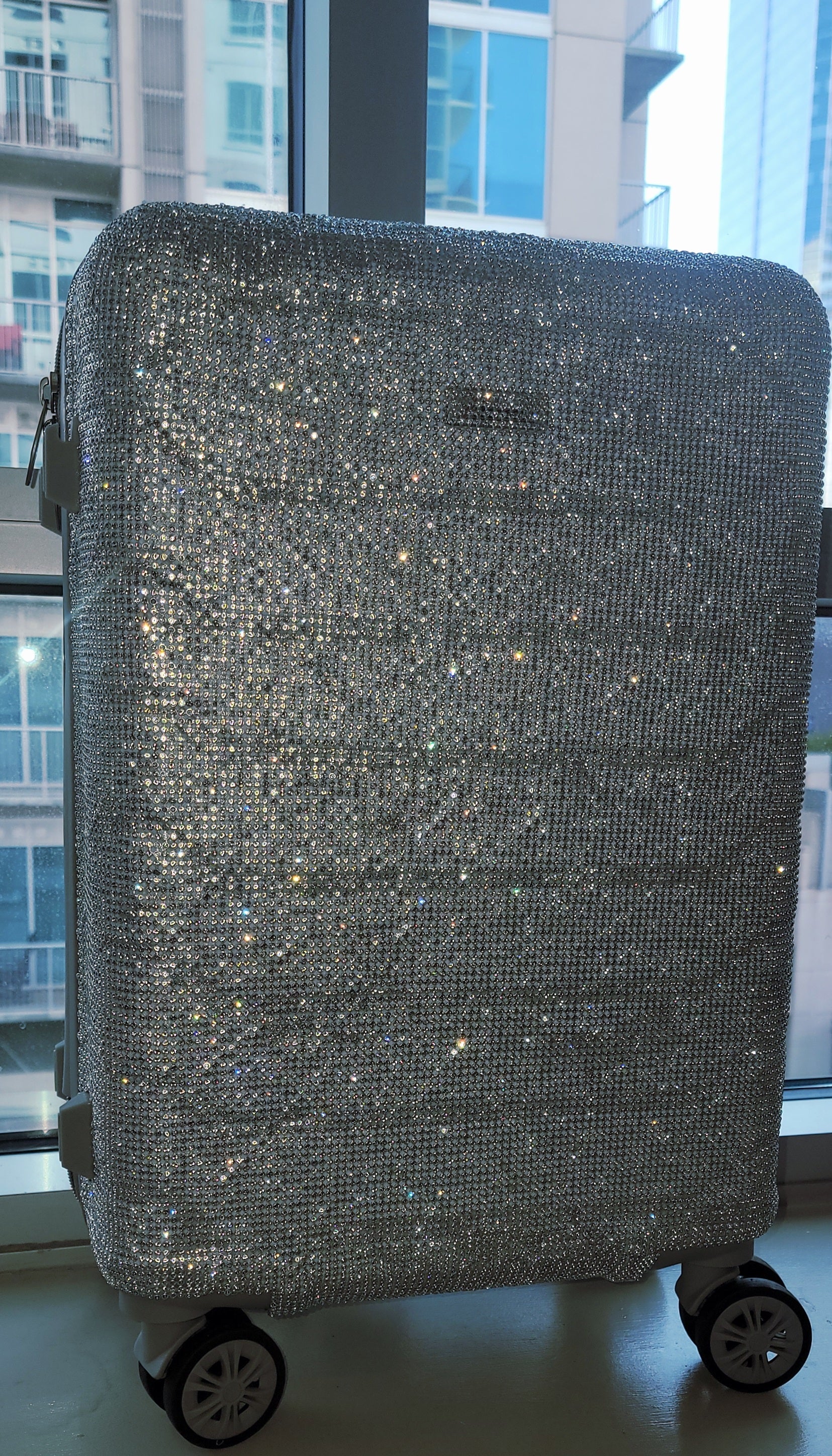 Upgrade your style and security with the "NEW YORK HEIRESS" Custom Order Silver Rhinestone Crystal Diamante TSA size Approved Carry-on Luggage Case. Perfect for travel, holidays, and special events, this bejeweled case adds a touch of elegance while meeting TSA size requirements. This carry-on is available by custom order only in your choice of available color. Other case sizes are available by custom order. Full Luggage set is available by custom order, which will incur a custom change fee. The matching boots are priced and sold separately. They are not included.