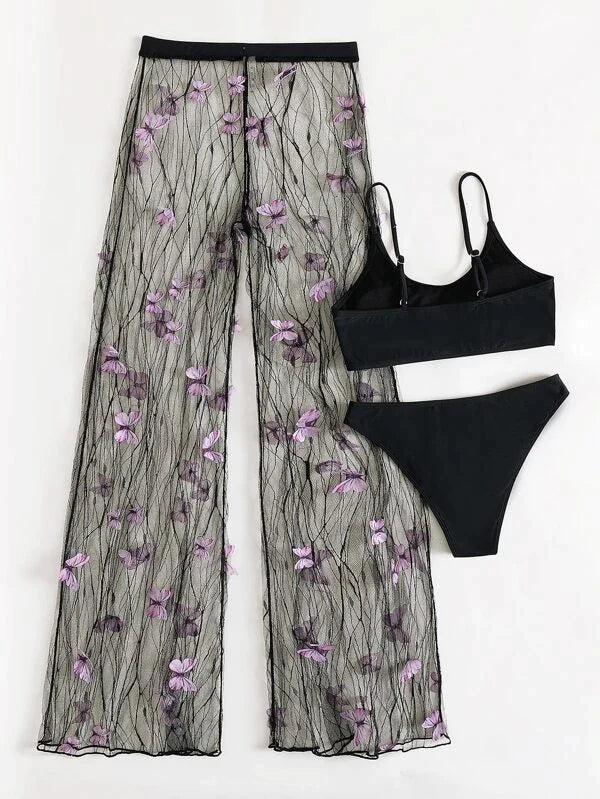 Sexy White & Blue Butterfly 3pc Bikini & Coverup Pant Set
